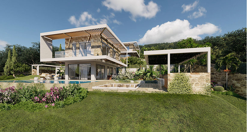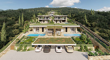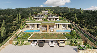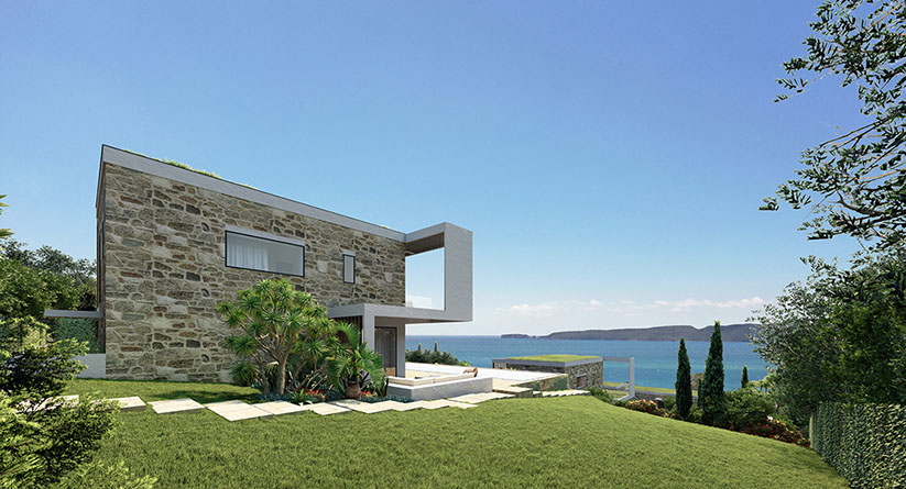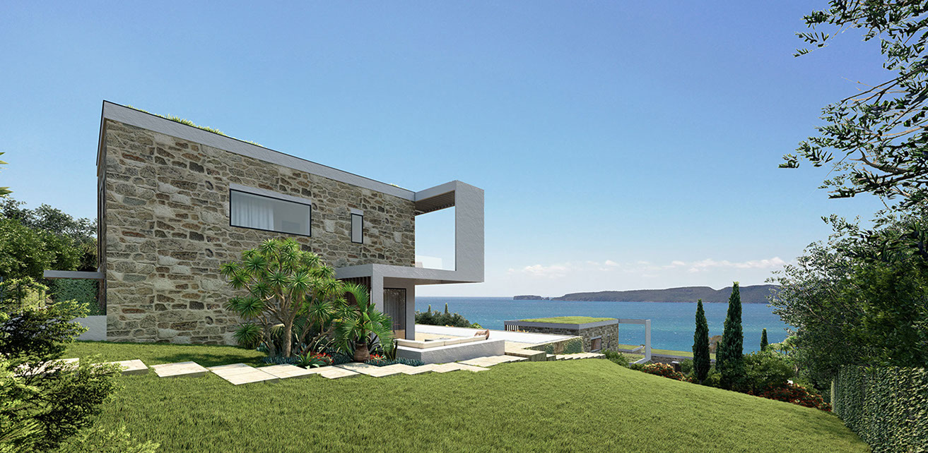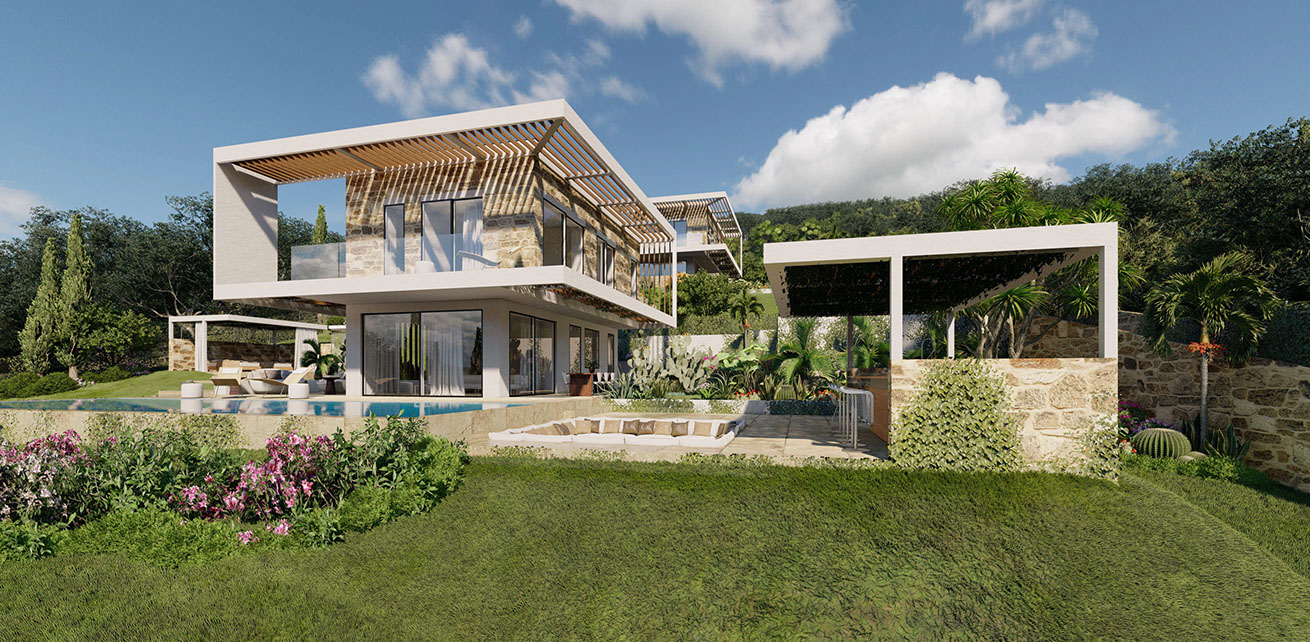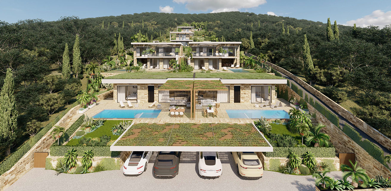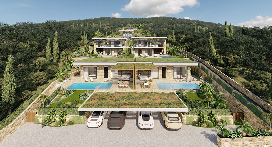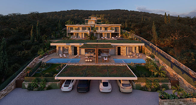 Πωλούνται συνολικά έξι αρχιτεκτονικά σχεδιασμένες βίλες με επιφάνεια κατοικίας 120 - 184m ². Κάθε σπίτι διαθέτ ει υπέροχους εξωτερικούς χώρους (εξωτερική σάουνα με χώρο μασάζ, τζακούζι, υπαίθριο μπαρ, βυθισμένο καθιστικό με τζάκι), συμπεριλαμβανομένης ιδιωτικής πισίνας, θέσεις στάθμευσης και εκπληκτική θέα στον κόλπο.